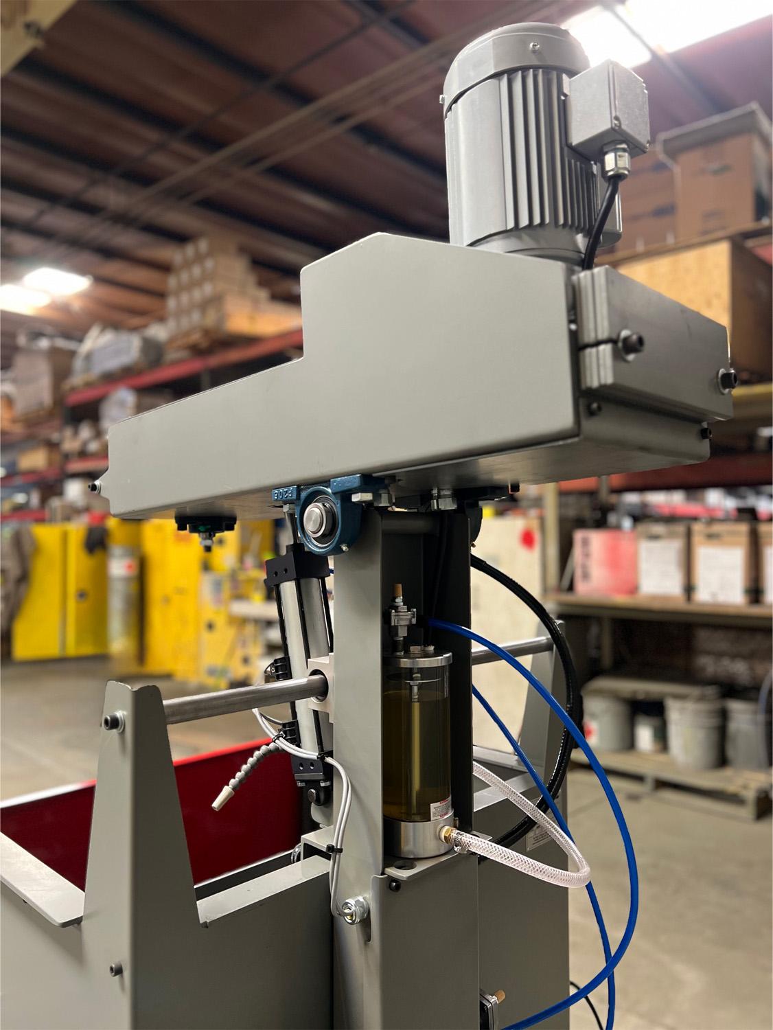 The patented stroke operating mechanism is an air over oil system. Air provides the power for stroking while oil is the transfer media. This provides for a smooth controlled stroke. Increasing the air pressure increases the speed of the stroke. The location of the stroke and the upper and lower limits are set by adjustable limit valves on the front of the center column.